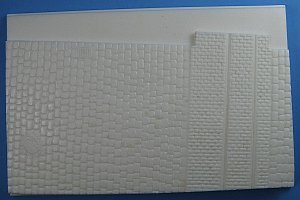 The base is a cobble stone street with a sewer grate and manhole cover, plus a brick paving stone section with a narrow gauge track that leads to the shipping doors. Measurements for the raised road portion are 5 1/16" (128mm) wide & 3 3/16" (81mm) deep. The portion of the base that sits on the shelf is 5 1/4" (134mm) wide & 3 3/8" (86mm) deep. Total thickness of the base is 13/32" (11mm) thick.