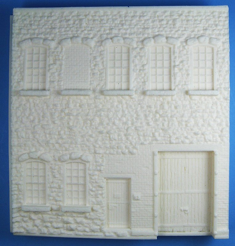 The building front has 7 windows, one of which has been bricked in, an entry door and a shipping/receiving door. The width is the same as the base, while the height is 5 3/16" (132mm). Thickness is roughly 3/4" (20mm) not including the window sills or door jambs. According to Full Circle Hobbies the total height of the diorama including the building front and base, is 5 3/4" (145mm) tall, and is designed to fit any standard size shelf or bookcase.