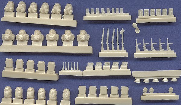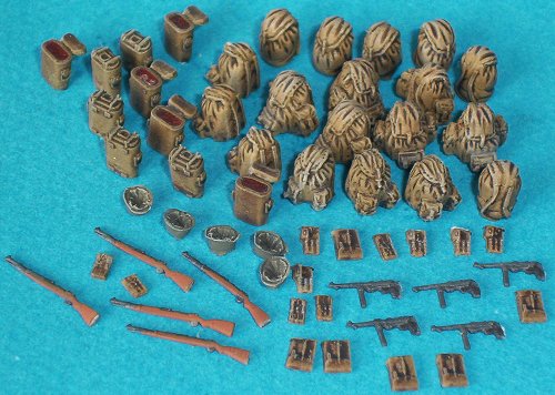 ![]() Continuing with their line of accessory sets, Goffy provides with this set a variety of equipment for the WW II German foot soldier. Some of this stuff can be obtained elsewhere, but some of it is quite unique. The weapons are very detailed for such small items. Two styles of ammo pouches are provided for the MP-40s, as are map cases, helmets and officers' caps. Three styles of duffle bags are given, but the really neat items here, which I've not seen before, are the food containers. Many of the autobiographical accounts I have read about the German infantryman's experiences on the Eastern Front always make mention of the troubles in getting hot food to the front line troops, so it is really neat to see these hot food containers made available to us for dioramas. There are two types: closed, and open with separate lids.