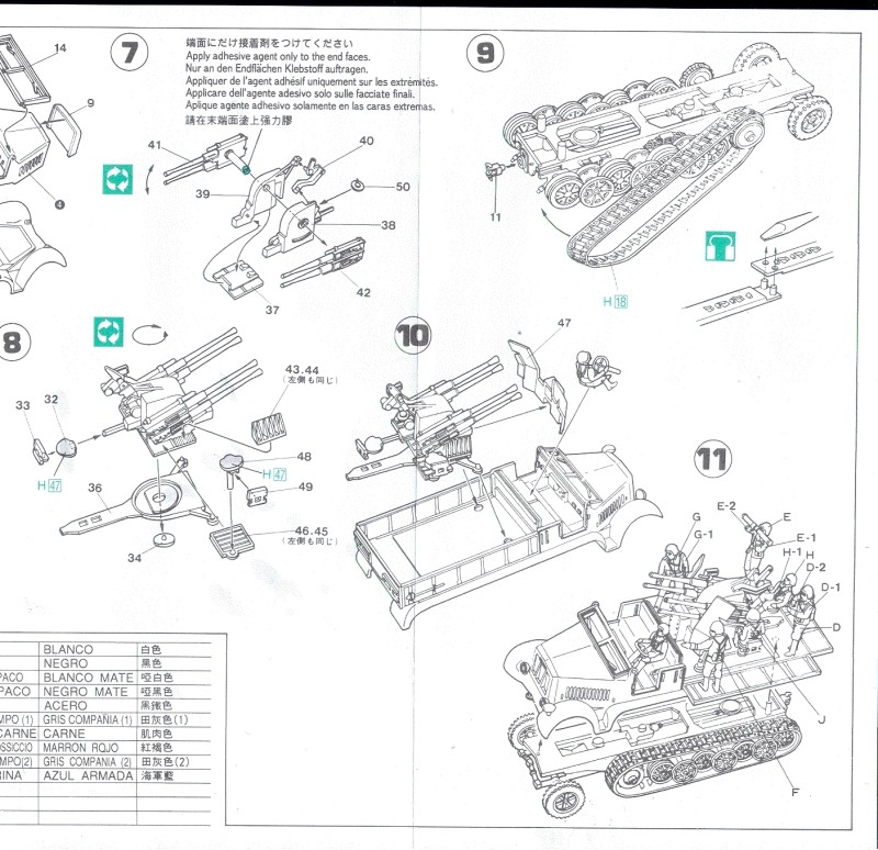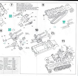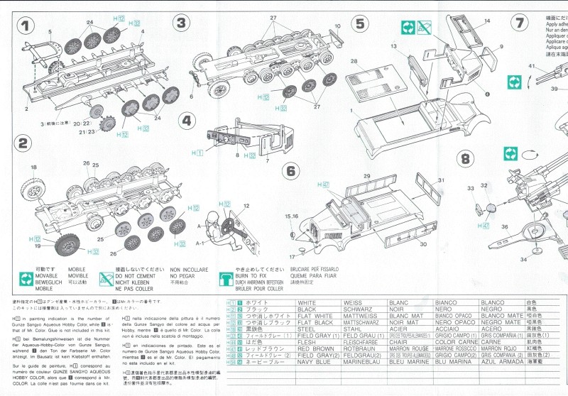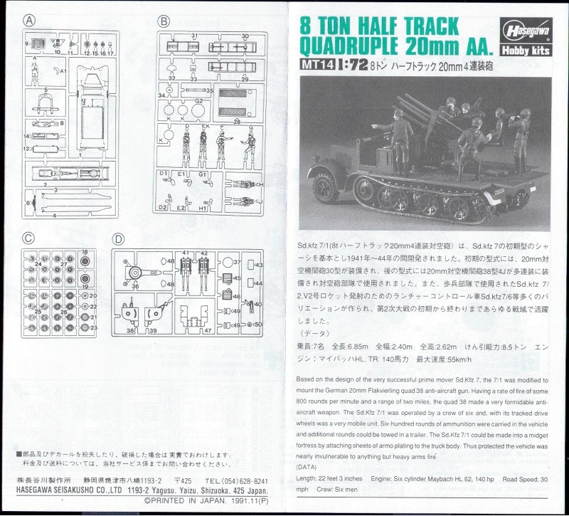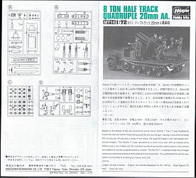First, like all the Hasegawa minibox series, this kit contains sprues of light, very hard plastic, with its advantages and disadvantages. On the plus side, the hard plastic is very easy to cut from the sprue and does not break easily. On the minus side, for some modellers, it may be catastrophic trying to clean the parts with a small knife. Personally, I nicked my fingers many times before the parts were free from flash and seams. Building the model is straight forward. Instructions are very accurate. The kit has a detailed chassis, which is great plus for all Hasegawa models. It's detailed but on a sane level with no tiny, easy to break parts - all solid like a rock. Parts have mini slots for a more accurate fit. You may not want to glue the wheels on until the painting stage because the Sd.Kfz. 7/1 has rubber-covered wheels (which means the rubber must be painted black or "rubber" color in contrast to the main model color of gray or sand). The instructions direct the modeller to not glue the front window frame so it can move (upward and downward). The dashboard is less detailed. There is a steering wheel and an engraved plastic dashboard and some parts that I think represent the gear shift levers. The body of the Sd.Kfz 7/1 may be built in two ways: ready for action with the sides folded down, or in transport mode, with the sides folded up. The gun can be built so it can rotate 360 degrees. The gun is nice. It is very similar to the Italeri's version of the 20mm FlaK. The barrels need to be drilled to simulate reality. The kit also contains seven crew, one being the driver, and the remainder to man the gun. Their quality is satisfactory, though the legs and arms are crude with plastic seams on the heads. They need some work to make them better. The tracks are rubber. On the model they look bad, so replacements should be found if possible. Overview: This is a good model with many moveable parts though it is little hard to word with some of the smaller pieces. |