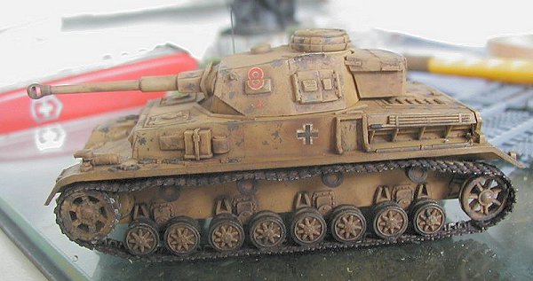 Before applying the decals, I applied a small layer of future that prevented silvering and still helped them to conform to the irregular surfaces. The markings came from T.L. decals. Their line has fine decals, but the swastikas, even the smallest ones, as the ones found on the Africa Korps palm trees, are split, certainly a imposition by some legislation. But the fact is that it was impossible to me to mount the miniature swastikas. To disguise this defect, I applied pastel chalks on all the symbols aging them, turning what would be a flaw into a natural weathering.