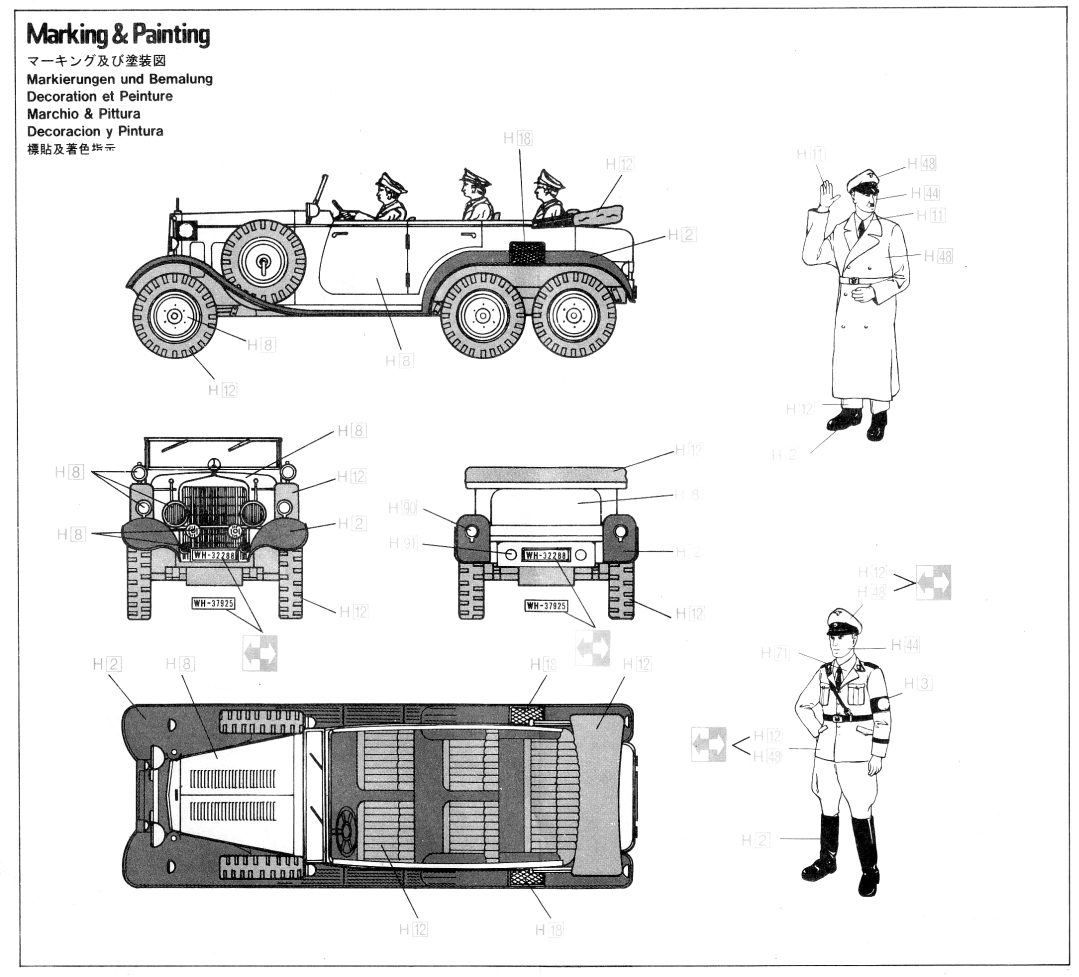 The painting guide and the stickers are for a pair of cars used by Adolf Hitler. Two plate numbers are provided: WH-32288 & WH-37925. According to reference [3],