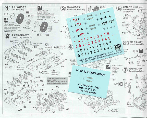 The first several steps of Hasegawas exploded-view instructions show assembly of the suspension lower hull and wheels and are the same as with Hasegawas other SdKfz 234 armored car kits. At about Step-6 the instructions get to the assembly of the turret particular to this model. The water slide decals shown here is the typical high quality decals Hasegawa offers along with an additional correction sheet with license plates.
