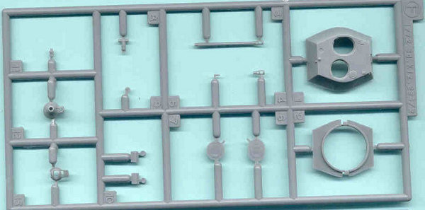 This look at Sprue F is of the SdKfz 234/4 turret particular to this particular vehicle. After this scan was made the gun barrel broke while in the box just behind the muzzle break and was not successfully repairable; this justifies my first impression that the 50-mm gun barrel for this Hasegawa kit is too thin. Like the rest of the model the molding is crisp and with few defects like sink holes.