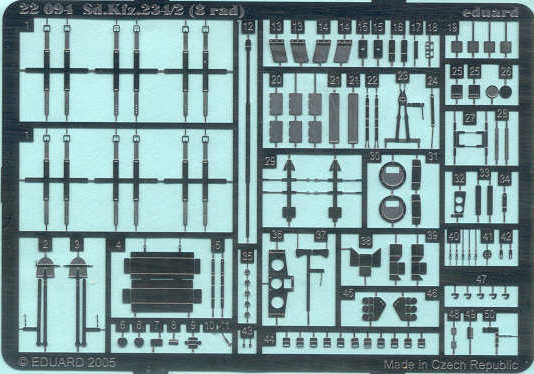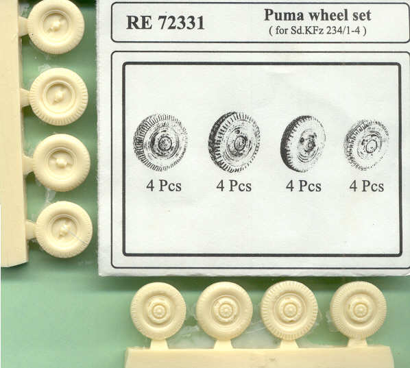 Well first look at the boxart to see what kind of vehicle we are supposed to have in the box, what it should perhaps look like when the model is done and to get inspiration and information as to the camouflage and markings. The SdKfz 234/2 8-Rad Schwere Panzerspahwagen (8-wheeled heavy armored car) is to me an impressive vehicle with all wheel drive, all-wheel steering and fore and aft drivers positions making it very advanced for its time and at home cross country or on roads. The SdKfz 234 Puma is the only version of the SdKfz 234 with an enclosed tank-like turret. In the turret we see a long barreled 50-mm gun similar to that in the Panzer III J but with a muzzle break to lessen recoil. On either side of the turret are two sets of three smoke grenade discharges to hide a quick getaway. We see four to six fuel cans strapped to the fenders but being diesel powered this is not as dangerous as carrying gasoline (petrol). On either side of the tubular bumper are rod width indicators with white knobs on them. On the engine deck behind the turret is a star-antenna indicating this is a command vehicle with an additional long-range radio set, however this antenna is not included in the kit. This reminds me about an interesting thing I read about German aerials, they were made of hollow copper rods, not flexible whip antennas as Ive some modelers depict them. Rather than black, the tires are a dark gray with black-gray shadows in the tread pattern. Under the bow the independent suspension and steering arms are visible. The vehicle color is a base coat of Dunkelgelb (Panzer yellow) with a pattern of green. THE PARTS