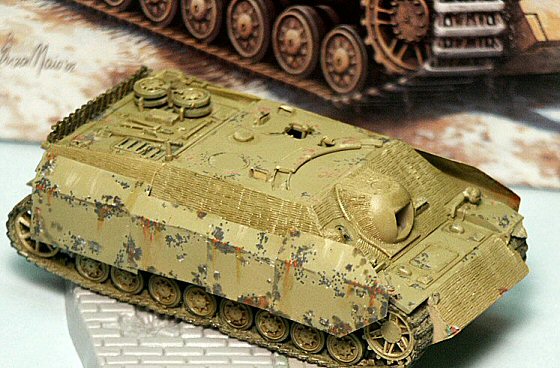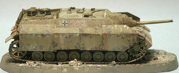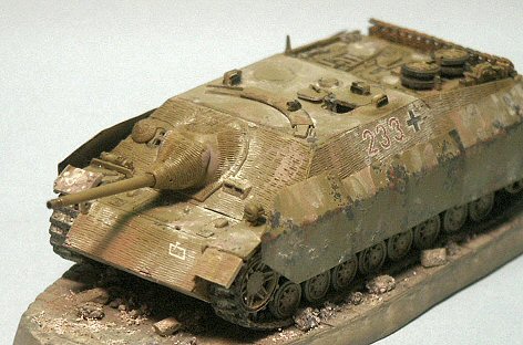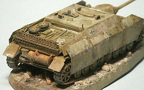 Here we have photos of the bow (left) and stern (below) of the completed JgdPz IV model. The Hasegawa water-slide decals have been applied over a coat of gloss acrylic then plenty of Solvi Set applied to get the decal film to nestle down into the recesses of the zimmerit pattern. After the decals are satisfactory, I sprayed on a light coat of acrylic flat coat tinted with 5% to 10% tan paint to tone down the base coat and markings. The Jagdpanzer was given a dusty coating by painting on MIG dry paint pigments with a wet brush; then, after the pigment was dry, the excess was brushed off with a small stiff brush. The display base is part of an old 1/76-scale Matchbox kit. |