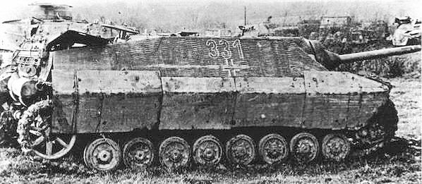 This is my inspiration for this middle or late-production JgdPz IV; a vehicle with modified schuerzen (5-mm thick side skirts for protection against anti-tank rifles and HE shells). The top third of the schuerzen appear to have been bent inward to match the 30–degree slope of the side superstructure armor. There are some distinct long horizontal scrapes on the skirts and on the superstructure's zimmerit like the vehicle drove and scraped through heavy forest or urban buildings, but I do not believe this scraping is responsible for the angled side skirt. The bending of the schuerzen plate appears to me to be too regular to be an accident or not intentional, that is just my assessment. Other details include a short L48 barrel threaded for a muzzle break but not fitted with the muzzle break, there is spare track on the rear plate, and a horizontal cylindrical muffler. Roadwheels are rubber tired with the late war forged hub. The rear idler wheel is the tubular welded type and the sprocket wheel is the late cast type. The superstructure has a zimmerit coating though it appears that the side skirt plates do not. |