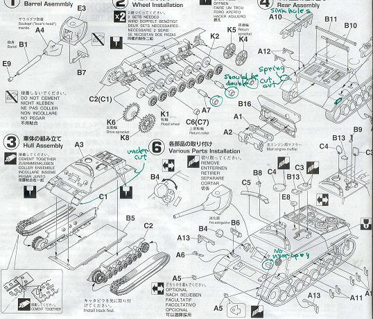 No figures, resin parts, or etched brass parts are included. Hasegawa’s instructions are black & white exploded view typical of Hasegawa kits and other kit makers. The instructions are clear and I noted no errors. This version of Hasegawa’s PzJgr IV has four return rollers per side (parts C6, A7 & C7), a later variant has only three return rollers per side. I like that the machine gun ports (parts B4) can be modeled open. Up by Step 4 please note that the rear fender had a cut out on the sides for a spring, see your reference photos for details.
