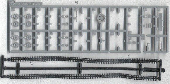 Hasegawa’s Pz IV tracks are the soft band type and are the weakest part of their Panzer IV based kits with very simplified detail. Rather than individual guide teeth (track horns) there is one long ridge running the length. These tracks are the same as in Hasegawa's old Karl w/Munitionspanzer IV within kit #31033/MB 33. I chose to substitute them by CMK’s more accurate soft-plastic band tracks. |