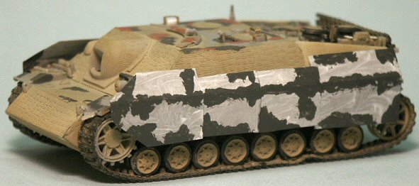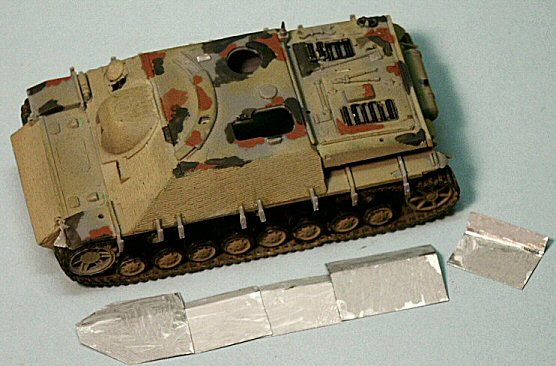 Painting & Weathering In order to show wear on the paint I chose to use the ‘salt-technique’ of replicating paint chips. For step-1 of the salt-technique, patches of dark gray were painted on to represent bare metal and red-brown paint to represent primer. At the bottom of the photo is the schurzen for the left side replicated with aluminum sheet of scale thickness. Typically I would use .010 styrene sheet to make 1/72 scale schuerzen but since the top third of the schuerzen had to be bent inward something had to be used to hold the bent shape; aluminum sheet was ideal for this. The schuerzen have been primed with acrylic white primer paint. As far as design and construction of Hasegawa's Jgdpz IV model, I appreciate that all three of the roof hatches can be modeled open, not so with Trumpeter's Jgdpz IV model. Notice how long the curved guard for the periscope gunsight on the roof is; based on the plans in Panzer Tracts 9-2 this is characteristic of the Jgdpz IV with the Pak 39 L48 gun, not the Pz IV/70 with the long gun barrel. Logic would tell me that we cannot therefore use this Hasegawa Jgdpz IV hull with the latter long barreled version. The curved plate over the gunsight opening (part C5) does not exactly match that in my references which shows the guard sitting in between the curved rails. This