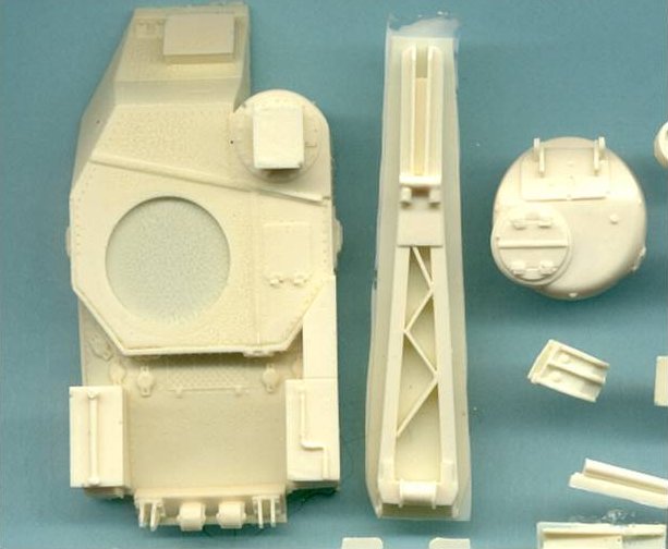 Also seen are rollers and brackets on the rear of the engine deck. Right of the hull is the crane boom molded onto a pour plug that will have to be sanded and cut away. The turret at far