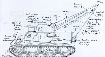 In the upper photo of the front right we see the original turret but with a dummy gun mounted on the turret rear and a large crane boom mounted where the 37mm gun would have been. The