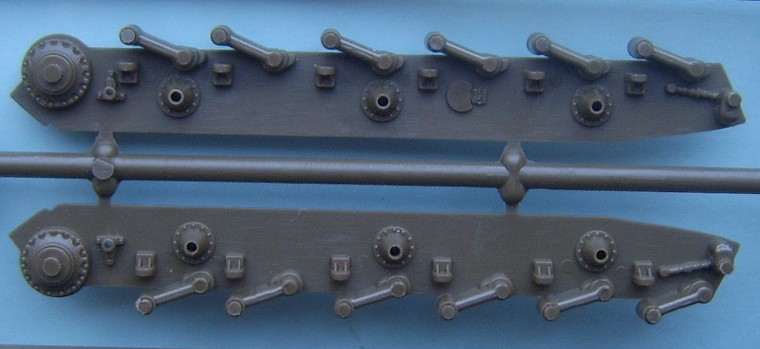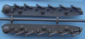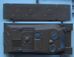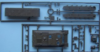 The Third release from Italeri using the IS chassis, this time it is the 122mm version and this time there is no simple version included. The kit uses the same hull as the ISU-152 kit with a new gun housing for the 122mm gun The main sprue contains the hull, gun mounts and hatches, suprisingly all the hatches are moulded open, (of sorts) although the drivers is moulded as an open space the visor is designed to be posed closed, but with a bit of effort could also be made open A closer look at the upper and lower hull the nose has some fine cast texture as has the gun mount The suspension is simplified in parts but is still a passable representation The only real problem lies with the half a shovel, although when compared to the Dragon Panthers half shovels the Italeri one is fully formed around the blade but is missing half the handle. The Track sprues are the same as used in the IS-2 and ISU-152 kits, the tracks are nicely detailed and the wheels are prehaps the best IS wheels in 1/72 having all the details but suffering slightly in depth.