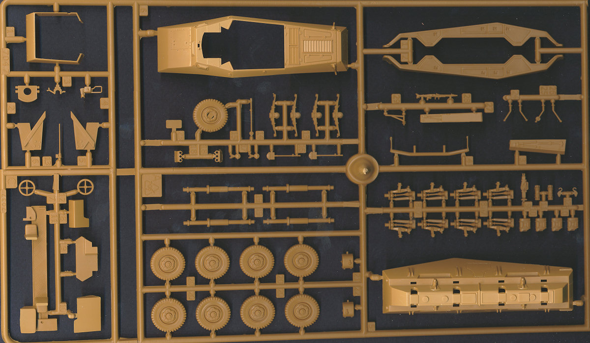 The main vehicle parts will look familiar to anyone with the other Italeri Sd.Kfz. 234 kits, as it is mostly the same. The primary difference with these parts is the upper hull, which has been modified to accomodate the PaK 40. Interior detail is sparse, and limited to only some bulkheads, storage boxes, and very poor driver's seats. Although the gun will block much of the interior view once mounted in place, there will still be a bit visible, so I think some effort will be required here to correct and improve upon the interior. Luckily, there is a photoetched detail set available from PART that includes many parts that will greatly improve this kit. Exterior hull details are basic, but not bad. Some pioneer tools are molded as separate parts, which is good, and others are molded in poor relief on the hull parts, which is not good. The small tie-downs molded onto the hull corners should be carved off and replaced, though the armored viewport covers look pretty good, assuming you want them closed. The exhaust pipes should be carved off and replaced, and the mufflers could stand to be improved a bit by the modeler as well. As with the other Italeri kits, optional parts are included to make a simplified chassis with workable wheels for those who want a quick build toy. The standard chassis parts are fairly well done and look good when built, though they lack some smaller suspension details seen in other kits. The wheels are nicely done, probably as good as possible for plastic parts, but for best results they should be replaced by resin aftermarket wheels, several designs of which are available. For those of you familiar with the old ESCI kits, this sprue may look familiar to you, as it is the PaK 40 that is included with the ESCI (now Italeri) German Guns Set. This of course means that it is pretty bad. While the detail on the gun is nothing special, the real drawback is the fact that for some inexplicable reason, the gun is molded in the recoil position, as though it is caught in the act of firing. Perhaps if you want to build a diorama depicting it thusly, this gun may not be too bad. But even so, if you can afford to buy a replacement gun, that would work best. Right now, the only PaK 40 sold as a separate kit is from Roden, which is pretty good. Other potential replacement guns can be obtained from other kits. By the way, the figures included here are poorly detailed, and in no way will fit within the confines of the kit's fighting compartment.