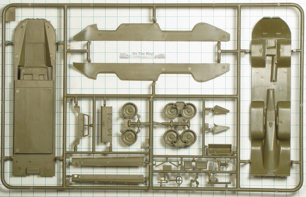 The parts are crisply moulded with no flash evident. The upper hull has several details moulded in place - the boat hook, spade and axe on the left front side, the