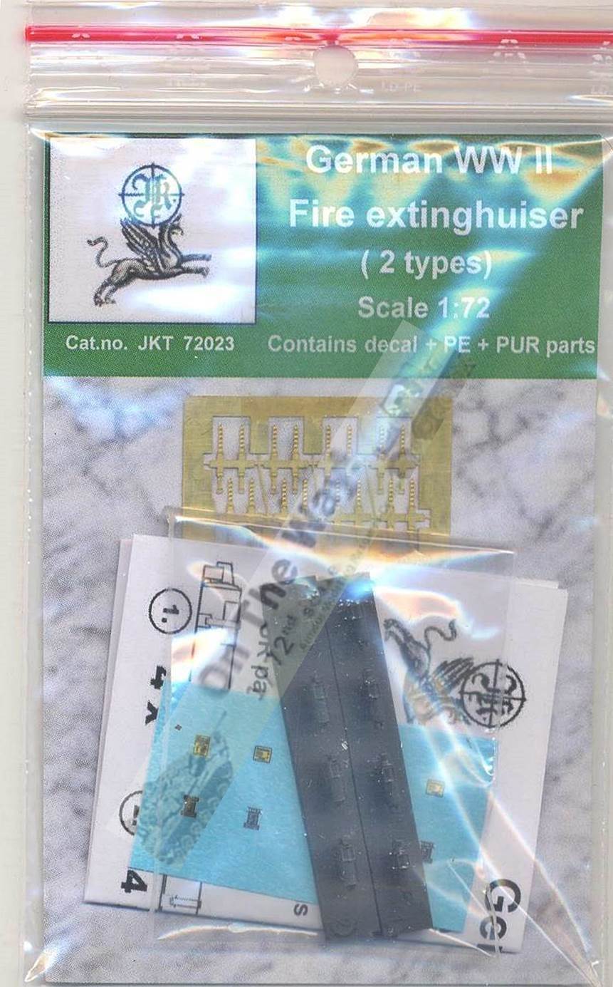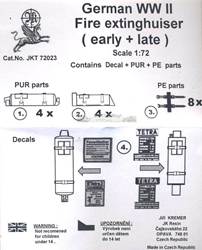 According to [1], the first was around 45cm long and the second around 42cm. Both had a diameter of 12cm. While it may be visually attractive to see red painted extinguishers on a model, they were actually painted in camouflage colors on combat vehicles. (A good discussion about these extinguishers can be found here.) For a simple item as a fire extinguisher, this set really raises the bar by a very wide margin, as it not only gives 8 exquisitely cast resin extinguishers, but also detailed clasps (in PE) and matching decals with lettering that is partially readable. The latter really is a novelty, even though these markings are rarely seen in period images of vehicles and equipment that has already seen some use. A note about the clasps: it seems that late in the war only one strap was used instead of the previous two. While the set mentions that the set contains early and late extinguishers, it doesn't tell which is which. The one on the right matches the Einheits-Tetra-Löscher, while the left one is close to a K2S Löschgerät, although not exactly. It might be that another type of extinguisher existed that I am not aware of. Measured against drawings in [1], the early type is about 5% underscale, while the late model is about 10% too small in length and 5% in diameter. In summary: this is a set that is light-years ahead of every aftermarket fire extinguisher that had been released to date.