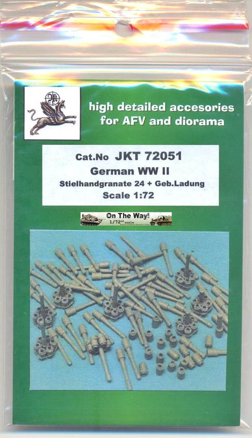 the WWI model. The parts are very delicately cast with very fine detail. Surprisingly for JK Resin, one grenade shaft was short shot, but apart from that, casting quality is perfect.. The Model 24 Stielhandgranate was stored in specially designed crates during transport, which could carry up to 15 individual grenades [1]. This is the subject of the sister set 72049.