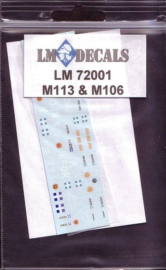 This set provides markings for 9 different M113 APCs & 1 M106 mortar carrier plus generic markings.