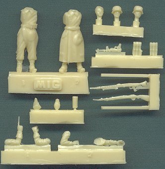 Two figures, expertly carved and cast. You get a choice of three heads, two with helmets, one without. The arms are also separate, which gives us a little latitude in personalizing our figures. Personal equipment is molded separate from the figures, which will look much more realistic than if they had been molded onto the figures as is typical. These are beautiful figures, and highly original.
