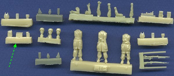 ![]() How often do we get figure sets that come with 32 parts for only three figures? This is a testament to MIG's attention to detail with this particular set of German Paratroopers. The figures are molded with separate heads, arms and equipment, which allows not only for better and more 3-dimensional detail, but also gives us the ability to personalize our figures to a certain extent. As with all of MIG's figures, the molding and casting are first-rate, and the only blemishes on this set are on a single row of parts indicated above, with an air bubble marring each of the three pieces on that stick. Poor quality control here, as that stick should never have been bagged up. Aside from that small defect, these figures are perfect. Thanks once again to Michael Hatch for providing this review set. |