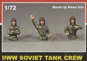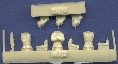 ![]() MIG is continuing with the WW II theme, but finally branching out from German subjects with this superb set of three tank crew for Soviet tanks and assault guns. Three half-figures are included, and I find their poses to be quite interesting. Two are very animated, obviously holding onto opened hatches, and the third with his arms crossed over his chest is a pose not often seen. Although the photo above makes them look a little robotic, note that the heads are separate parts, and the simple act of turning one to look to the side adds a whole new dynamism to the figure. The sculpting is superb, with excellent detail on the uniforms, and clear facial features. My only complaint is that the faces are all very similar, and these three fellows look as though they could all be identical brothers. I think they could have been made to look a little more unique by altering their facial features and expressions. The casting is excellent with no flaws of any kind in this sample.
