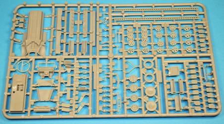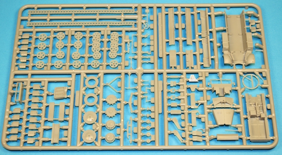but its tracks are actually shorter, not longer. The crew compartment is an insert that fits into a lower hull assembly. Interior detail seems very good on the sprues. A nice touch is the choice between headlights with a slit cover and hollowed out alternatives, which you can fill with transparencies of your own choosing. An abundance of jerrycans is provided,