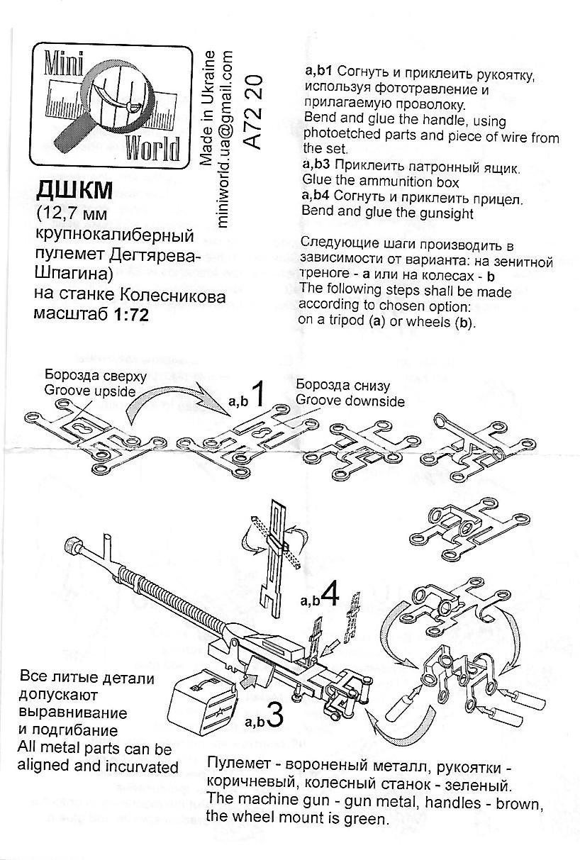The instructions are provided on a small sheet with captions in both Russian and English. A brief note provides basic colour information for the gun.