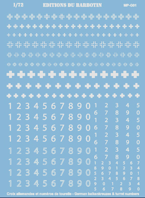 A mix of white Balkenkreuze and white turret numbers printed on individual carrier film. For the Balkenkreuze you can choose between three styles (narow and wide open and solid), each in three sizes. For the turret numbers you can choose between two styles (open and solid). The solid numbers come in three sizes, the open ones only in the largest size. You get each number four times, which is nice, but not enough (for instance) to mark vehicle 111 in a platoon. Printing quality of these decals looks very good on the sheets. |