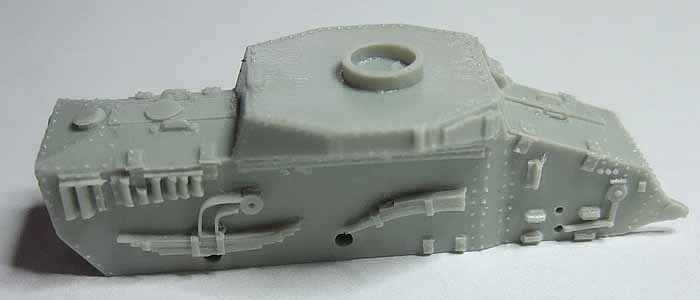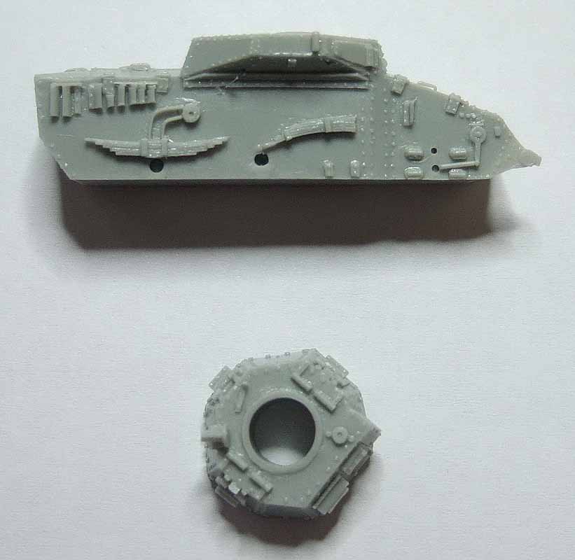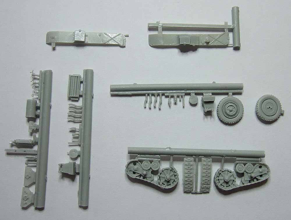 This kit is well packed in a sturdy box. Inside you find one of the tiniest AFV's you can imagine. The length of the hull without front roller is barely 5 centimeters; width without suspension is only 1 centimeter! Even for a kit that small, it is made from more than 40 parts. All of them are cast without flaws. Rivets and other surface details are crisp. The turret has an open hatch.