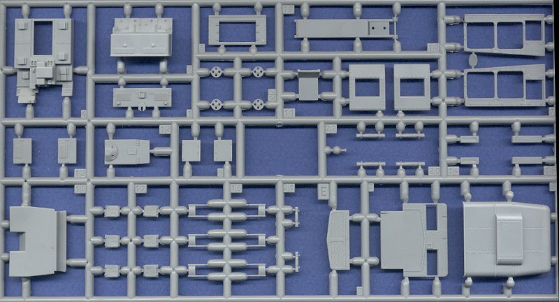 The following sprues show the new parts for this kit: The interior is completely detailed, and the modeler has the choice of showing it off with open sides, or closing it with canvas siding. Many of the clear parts directly replace some of the gray styrene parts - window, frame and all - requiring us to mask off the window for painting. This will give a much more realistic appearance than inserting an overly-thick clear part into an open window, as in most kits.