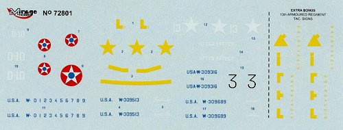 Decals are included for an outstanding six vehicles, including some training vehicles, some in North Africa, and one in the Pacific. Although I must point out the according to the single photo I've seen of the 193rd Tank Batallion M3 in the Pacific, it should be mounting the later rubber chevron style tracks (as seen on the ESCI/Italeri Sherman kits), not the solid rubber block tracks of this kit. Replacement tracks designed for Shermans (but also suitable here) are already available in different mediums from several companies. The decal quality looks fantastic, and as a bonus, additional tactical signs are included for the 13th Armored Regiment in North Africa.