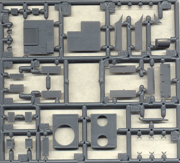 Sprue V is new to these kits, and has the upper hull and most of the detail parts. As you can see, there are some parts unique to each version here, plus some optional parts. All vertical plates are molded flat to allow for good bolt detail. Panel lines are recessed, and hatch handles are molded as separate parts, but they may be a little heavy, and should probably be replaced with bent wire. Storage boxes have separate lids so can be modeled open. Front driver's hatch is also molded open. Engine access hatches are molded shut, but with the flat parts layout, it should be easy to open them up if you wish to add an engine (not included).
