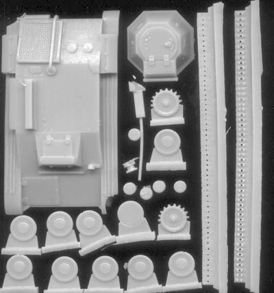 Since Modelkrak switched to JADAR for distribution, it seems that they have gotten away from using white metal parts for the tracks and wheels. I have several of their newer "JADAR" kits, and they are entirely in resin. For the wheels, this is a good thing, because I feel that the resin holds detail better than metal, but I really miss the metal tracks. I was willing to give up a small amount of detail for the ease of bending the metal tracks into the appropriate shapes around the wheels. Now we have to use the "heating" method to bend the resin, which can be difficult. But in the case of this kit, the tracks are not very detailed anyway, so I wish they had used metal.