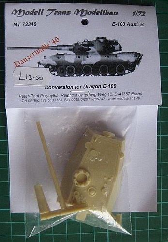 This conversion of the Dragon Armor E-100 super heavy tank (kit no. 7256) converts the tank from the Krupp turret of the Ausf. A (fielding a 150mm gun) into an Ausf. B with an alternative turret shape and sporting the 12.8cm PaK 44 L/55 used on the Jagdtiger. Since neither version was ever finished this kit belongs firmly in the Panzerwaffe '46 section of any German amour modellers collection. The Modeltrans offering comes in a simple plastic bag with card backing that doesn't help in keeping the contents safe and secure and it's worth transferring it to a more robust container if storage for a prolonged period is envisaged. Sad to say one of the four lifting lugs on the turret roof was missing on my copy due to this. The kit is a very straightforward affair consisting of the turret and two sprues, one containing the barrel, cradle extension and gunner's sight head (??) and the other containing the commander's cupola hatch. Since I have no references the item I believe to be a sight head may not indeed be such though it is clear where it mounts, in front of the commander's cupola where on the E-100 Ausf. A turret a sight does exist. The kit parts are generally moulded well with crisp detail, a small amount of flash and only a few air bubble holes, most evident on the turret rear, which will need filling. The turret base contains a significant moulding plug but should prove no problem to remove.