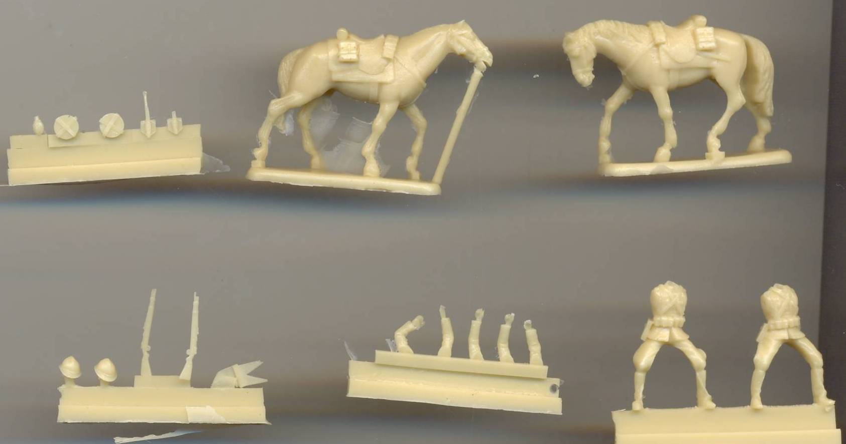 with a bread bag, map holder and (as separate parts) a canteen, a collapsable bucket for the horse, spade with bayonet and rifles. As you can also see in the pictures, the shaft of one of the spades was broken and lost to the carpet monster. Replacing that with some sprue will not be too big a challenge. Painting and correctly adding all the