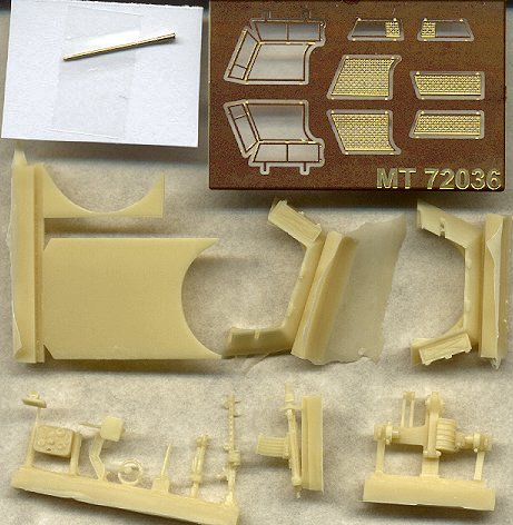 Primarily resin, but with some etched brass parts as well, this kit consists of mostly the 20mm turret, and only two parts for closing off the fighting compartment of the Hasegawa half-track. Consequently, this set could be used for any vehicle that used this turret, such as the Sd.Kfz. 140/1 Aufklärungspanzer from Attack. The parts are very highly detailed and cast with no imperfections I can see. The cannon barrel is turned brass, with the end drilled open (unlike the Al.By 20mm barrels), and may well be the best 20mm barrel I have seen. The turret is completely detailed inside and out. This is an exquisite set. Many thanks to Tracks & Troops for providing the review kit. |