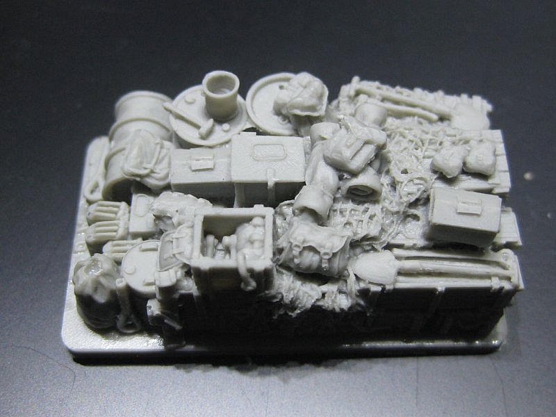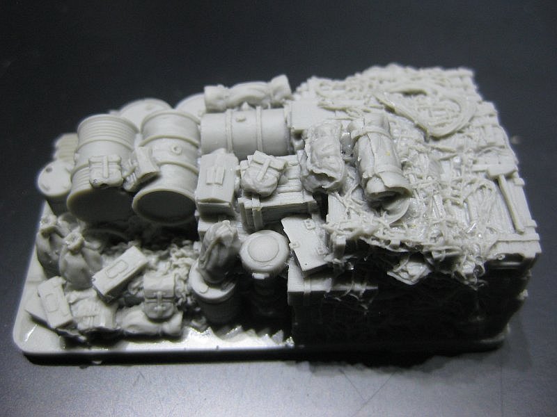 This accessory set from MR Modellbau consists of two cargo loads for supply vehicles though they could also be used as free standing elements in a diorama or vignette. The set comes in a simple plastic bag with card backing that doesn’t help in keeping the contents safe and secure and it’s worth transferring it to a more robust container if storage for a prolonged period is envisaged. As I have found with most MR model kits I have purchased the resin moulding is generally superb with plenty of crisp detail, minimal flash and no casting air bubble holes. There were a few locations where small bits of detail were missing, e.g. edge of a fuel barrel, but I’m not sure if this was due to the casting process or the lack of protection from the packaging. The base of each load does contain a significant 3mm thick moulding plug across the whole base which, depending on how the item will be used, may have to be sanded down. Unmodified, the smaller of the two pieces measures 48(L)x28(W)x21(H) mm and would be suitable for a medium sized truck or half-track. I checked its fit in a Hobby Master prebuilt Opel Blitz truck and with a small amount of filing of the base the fit is perfect. The larger load measures 61(L)x31(W)x26(H) mm and would be suitable for a large truck or half-track, e.g. SdKfz. 9 Famo, though I haven’t checked its fit in such a model. I believe that both loads are probably intended for German WWII vehicles since in the smaller load one can make out a German 10-tonne lifting jack and in both loads the wooden ammunition crates, fuel barrels and jerry cans also appear to be of German origin. That’s not to say these could not be used with Allied vehicles since a small amount of modification by the addition of the odd piece of allied equipment could hide certain items. These two items can be painted straight out of the box and should look very striking when finished. In summary, the kit is an excellently moulded accessory that can be used straight out of the box to provide more interest to any medium or large sized WWII cargo vehicle. |