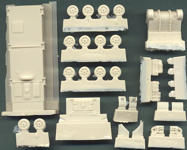 One of my most wanted Sherman variants, this kit follows in the tradition of the previous Sherman kits from this manufacturer. It is a conversion set, designed to be used with the Italeri (ESCI) M4A1 Sherman plastic kit. The bogie suspensions, tracks and some smaller details are meant to be used from the plastic kit, with the remainder provided in resin.