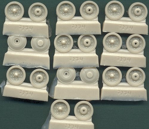 A complete set of wheels for one tank. Appropriate for most versions of the T-34. Very highly detailed, and mostly well cast, except for several bubbles in the hubs. This is a very nice set, and I need to get several more of them.