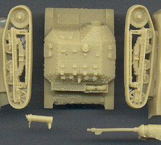 This kit shares the same weakness as that earlier model, that being the poor representation of the tracks, however, the wheels and suspension are highly detailed, and look fantastic. The spare wheels on the rear of the superstructure are very well molded, as is the engine vent, and the separate exhaust can. The gun barrel is warped, so I will try to fix it by heating and reshaping; if that doesn't work, I'll simply cut off the muzzle and replace the gun tube with styrene rod of the appropriate diameter.