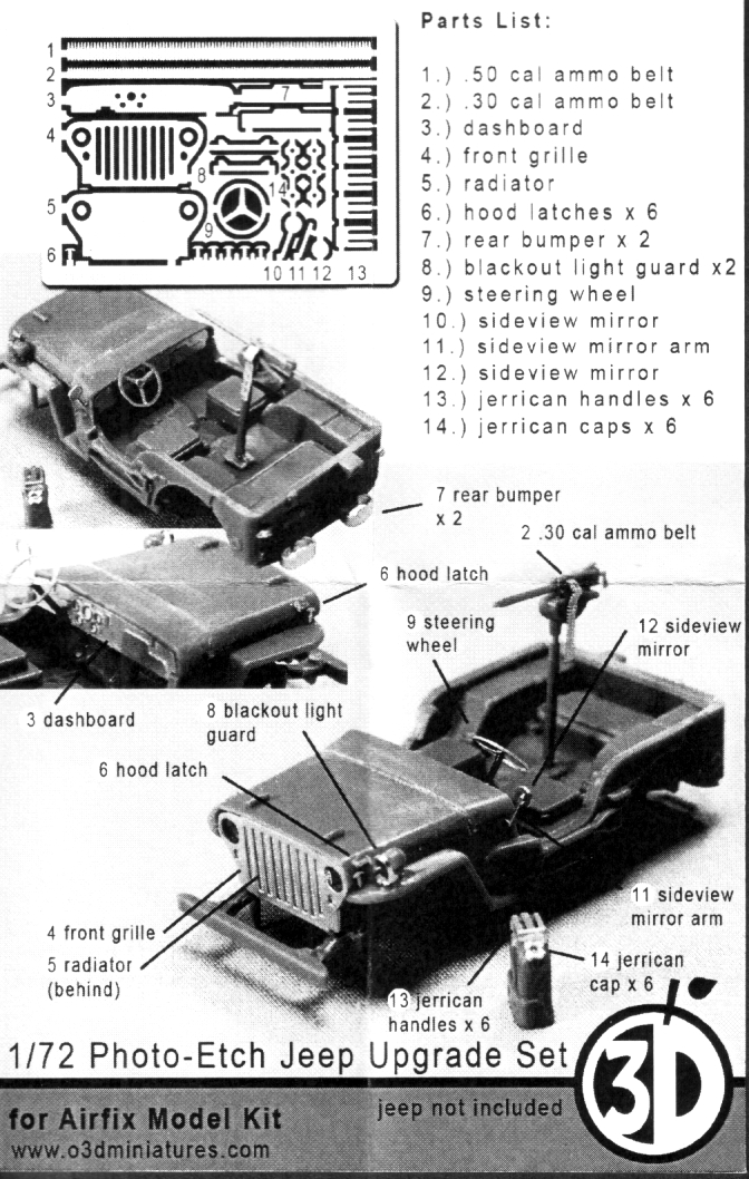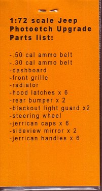 The hood latches are quite small and will need a deft touch so as to not lose them to the "carpet monster". I'm not too sure that the steering wheel is much of an improvement as it is quite two dimensional and flat looking. In my opinion, it would have been better to have the steering wheel replaced with some etched pieces for a .30cal gun bracket, tire chains, or both. The two ammo belts look nice and give you the option of either mounting a .30cal or .50cal gun while the remaining belt can be used on another model. As for the jerry can parts (handles and caps), I'd suggest that the rather poor Airfix cans be replaced with better ones so as to get the best value from the O3D parts. There are two light guards, and depending upon which of the many Jeep varieties and modifications you choose to model, you may have a spare guard or two for other jeeps.