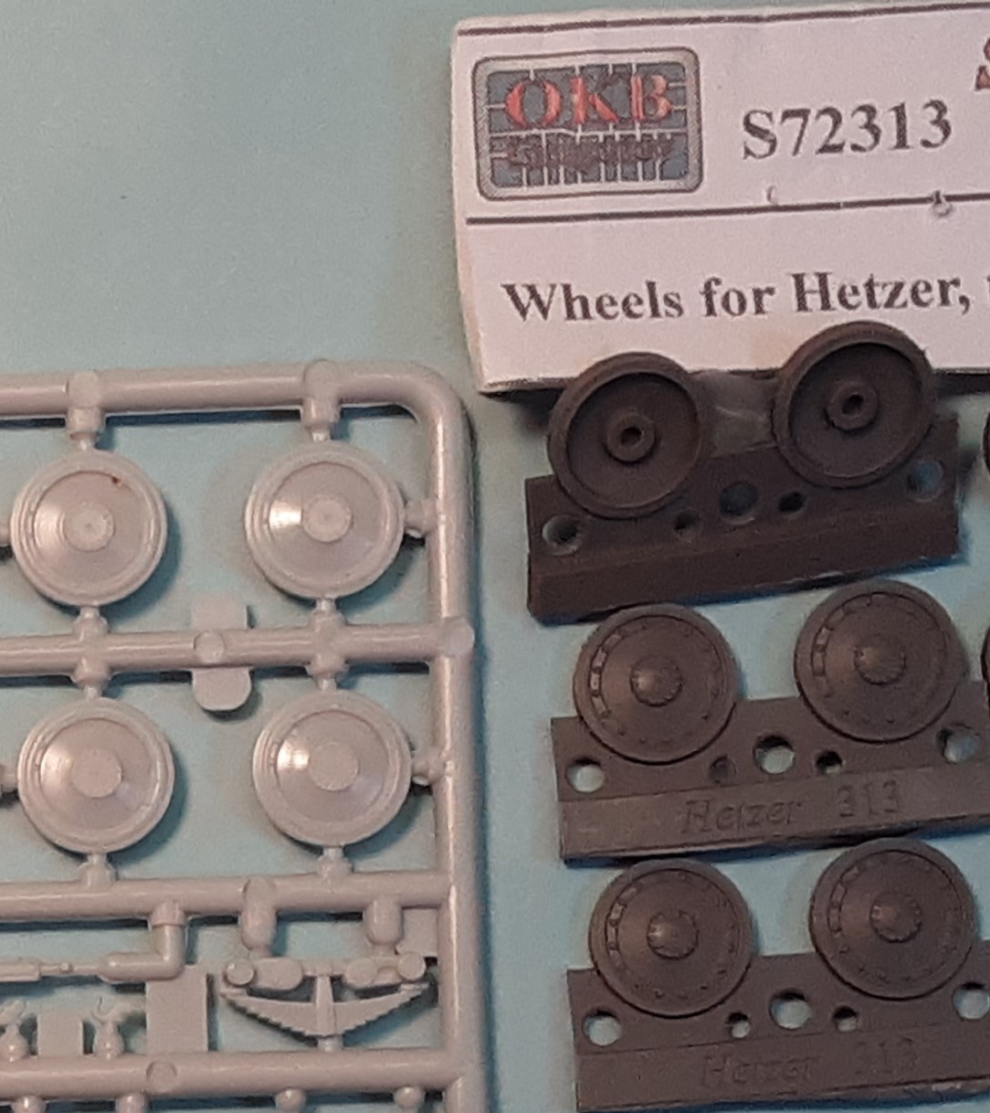 The pale-gray plastic roadwheels at left are from a UM Hetzer model and are also the 16-bolt type. At far left are 32-bolt roadwheels from UM and from the Attack Models kit.