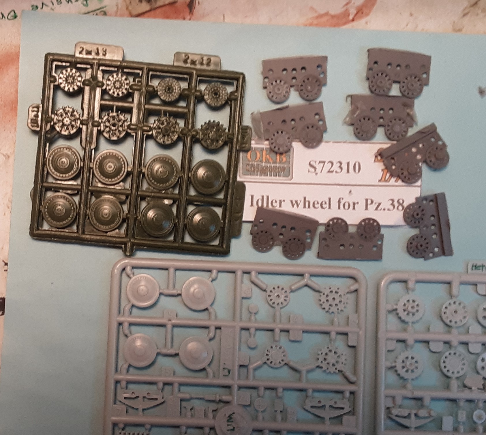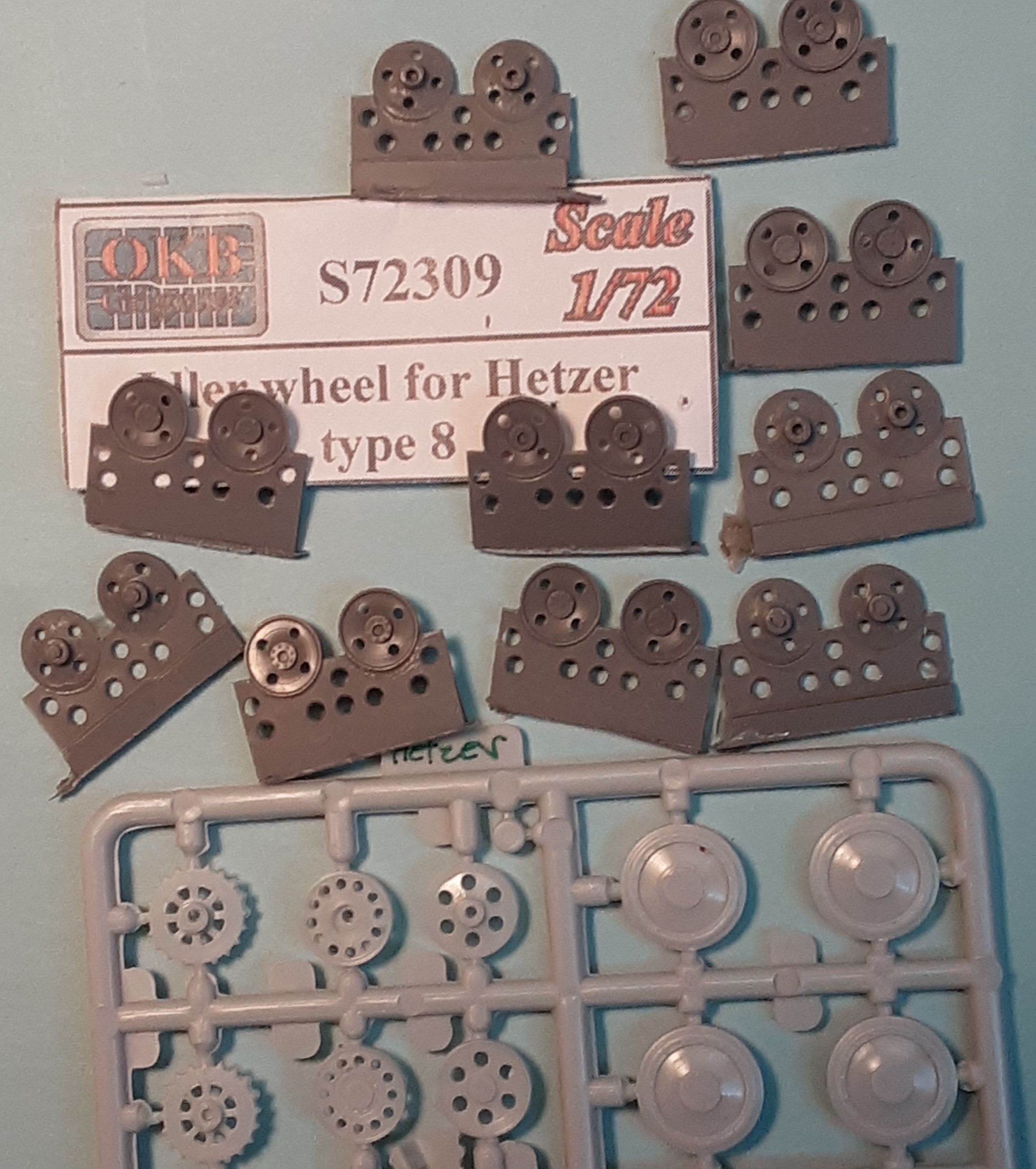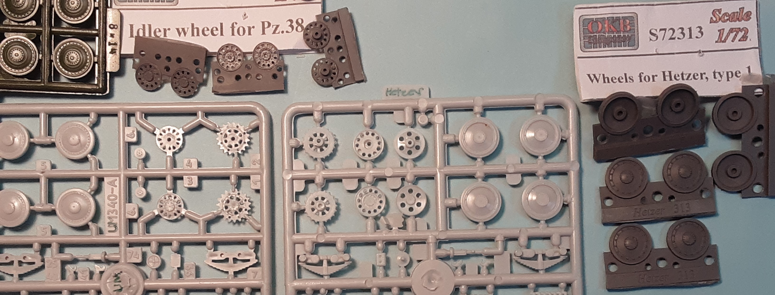 These OKB Set S72313 roadwheels measure to be 11 mm wide. This compares to 11.5 mm for the ESCI Hetzer and Marder III, 11 mm for the UM Pz.38 and Hetzer models, and 11.5 mm for aftermarket resin roadwheels by AlBy. Based on this I assess these would be passable for both the Pz.38 variants and Panzerjäger 38 in 1/72-scale.