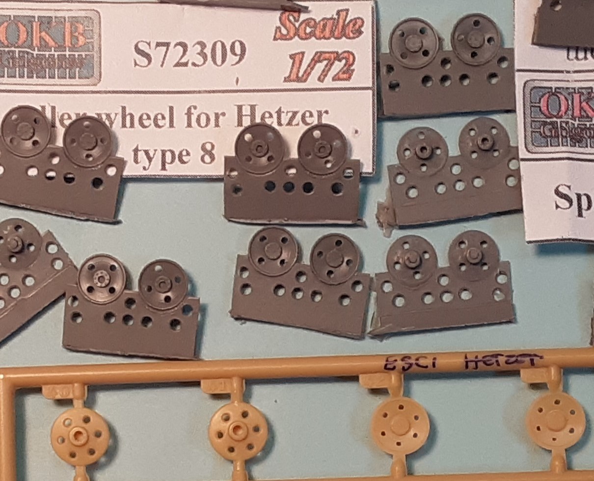 OKB’s S72309 compared with the 6-hole idlers with the ESCI Hetzer models. The six tiny holes on the ESCI outer wheels are an anomaly and these holes should be the same larger size as in the inner wheel parts to the left.