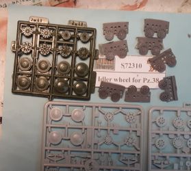 OKB Grigorov Set S72310, Idler Wheel for Pz 38(t) comes with 20 Medium gray cast-resin wheel parts on 10 pour plugs in a small ziplock bag. There are 10 inner and 10 outer idler wheels, enough for five vehicles. This is the most common style of idler wheel for the Pz 38(t), Marder III and Grille self-propelled gun and other evolutions of the Pz 38. At left is a sprue of wheels from a short-run, injection molded, plastic Attack Models Pz 38(t) kit. I’m not impressed with the poor molding of the Attack Models wheels, and OKB resin aftermarket replacements are much superior, especially with a replacement resin track set. At bottom are the good injection-molded plastic idler wheels by UM for their Hetzer kits.
