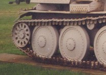 Here is a close-up of the idler and roadwheels on a Marder III at Aberdeen Proving Grounds, Maryland, USA; a tank destroyer built on the Pz 38 chassis. This idler wheel is common to the Pz 38, Grille, and Marder and matches the OKB idler set S72310. Looking closely, the 12 oval holes are not true teardrop shape but each look to be overlapping larger and smaller holes. The roadwheels are the initial type with 32 bolts around the rim and tire.