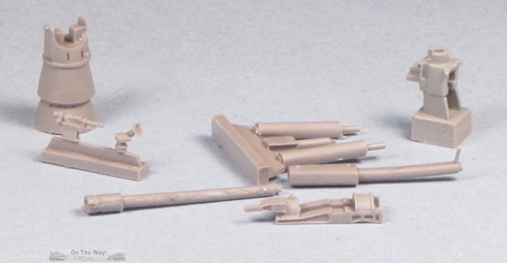 on top of dark grey shading used for the resin parts is difficult to read. Complex assemblies such as the gun and mount are shown in several views, each