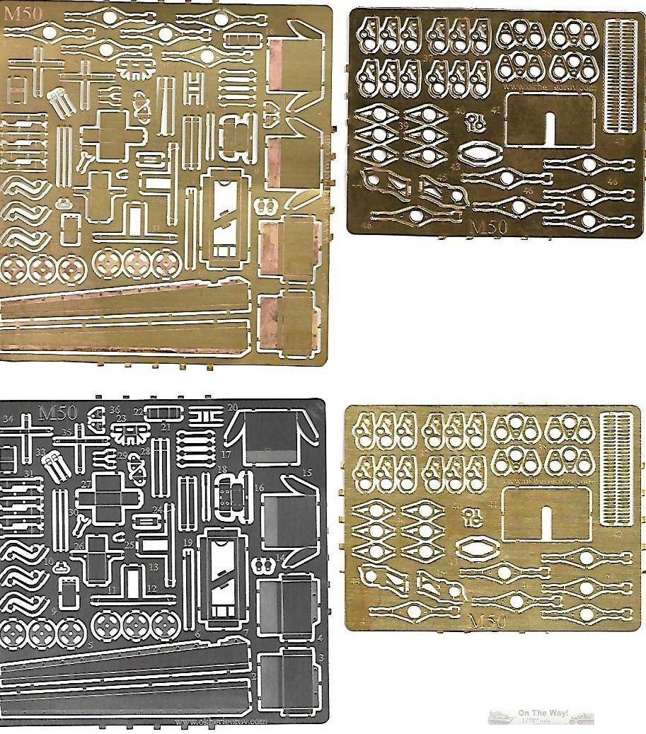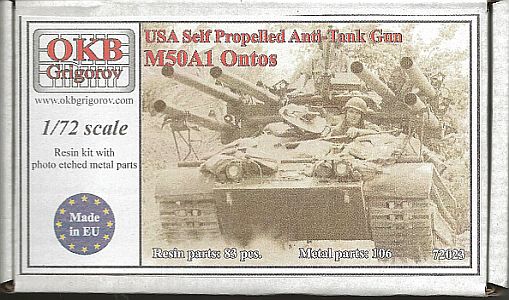 The kit is packed in a sturdy box with an illustration of a sandbagged M50A1 on the lid. Inside are 76 grey resin parts (the box says 83), two photo-etched frets
