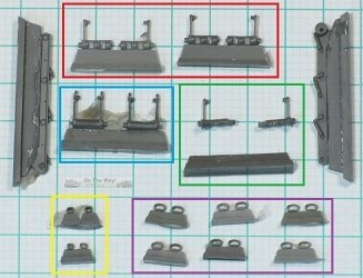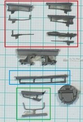 out the parts. The two pairs of 'plain' suspension mounts (parts R27 - left and R28 - right, red box in below photo) mount the second and third paired roadwheels.