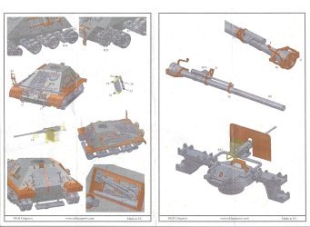 Two frets of PE parts are provided. A brass-coloured fret 0.2 mm thick includes the barrel travel locks, and the various brackets and clamps for the recoilless